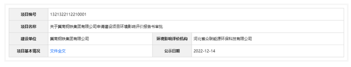 2022年12月14日,根据建设项目环境影响评价审批程序的有关规定,经审议,河北省生态环境厅拟对冀南钢铁集团有限公司申请建设项目环境影响评价文件作出准予批准意见。