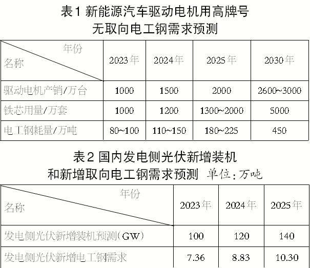 从市场端看,一是2022年我国生产新能源汽车驱动电机用高牌号无取向电工钢约63.32万吨,同比增长84.82%;二是实现了我国新能源汽车驱动电机和高牌号无取向电工钢生产的同步增长,使用的主要牌号有中国宝武B27AHV1400、B30AHV1500、B35A300等,首钢25SW1250、25SW1300、27SW1400、30SW1500、35SW1900等,太钢35TWG250、30TWV1500、25TWV1等,其订货量较满或需求较旺。