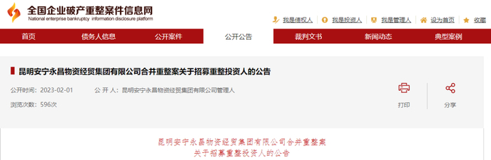 近日,全国企业破产重整案件信息网发布《昆明安宁永昌物资经贸集团有限公司合并重整案关于招募重整投资人的公告》。