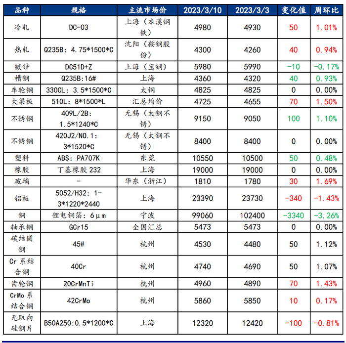 截止2023年3月17日,各原材料当日即时价格以及价格周环比情况如下: