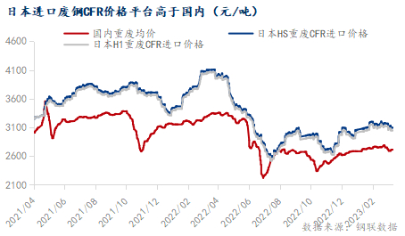 导致再生钢铁原料进口量难有放量的核心原因在于其进口价格平台高于国内:过去十年以来,除2019年和2020年受政策限制国内废钢进口量骤减,自日本进口的废钢量降低至20%水平,其余历年我国从日本进口的再生钢铁原料基本维持在60%以上。但日本出口的优质废钢到我国的CFR价格平台高于国内(2022年国内重废≥6mm市场均价在2870元/吨,而日本HS、H1重废CFR均价在3000元/吨)。进入2023年,进口价差倒挂300元/吨左右,考虑到时间成本和海外价格波动的风险,进口商对进口海外废钢的积极性较低。