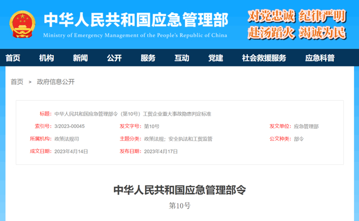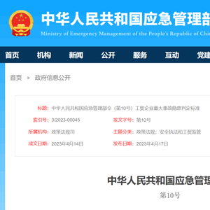 《工贸企业重大事故隐患判定标准》已经2023年3月20日应急管理部第7次部务会议审议通过,现予公布,自2023年5月15日起施行。