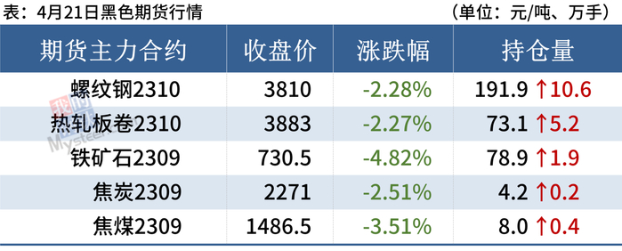 废钢:4月21日,全国45个主要市场废钢平均价2636元/吨,较上一交易日价格下调14元/吨。华东主导钢企废钢采购价格下调,从而引领钢厂下调。具体来看,众多钢厂因减产而减低日耗,从而废钢用量相应下滑,叠加成品材价格持续下跌,钢厂短期内利润难以改善,为降本增效势必进一步下压废钢价格,且电炉厂基本全面亏损,承压生产,多数处于不饱和生产状态,因为废钢需要顺势减量。另外,铁矿石价格下滑后冲击废钢优势,所以废钢失势后价格下调显而易见。因此,预计下周废钢价格持续偏弱运行。