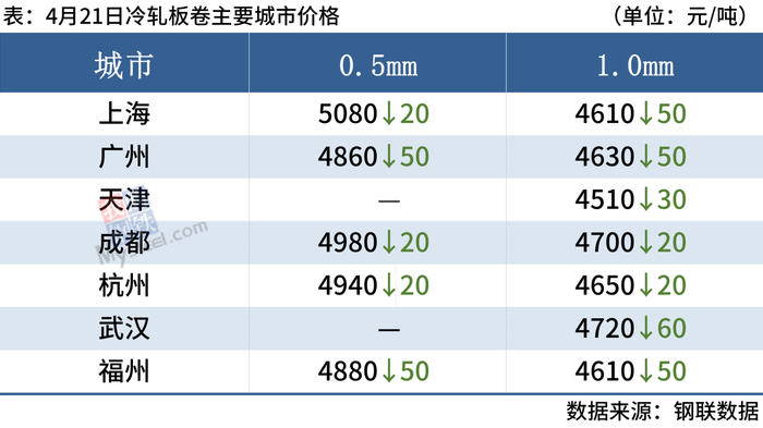 冷轧板卷:4月21日,全国24个主要城市1.0mm冷卷均价4695元/吨,较上个交易日下跌29元/吨。热卷期货盘面大幅下跌,商家心态谨慎为主。需求方面,“受买涨不买跌的”心态影响下,商家反馈市场成交偏弱。综合来看,商家对后市缺乏信心,市场交投氛围冷清,需求表现不佳,预计下周全国冷轧板卷价格或将震荡偏弱运行。
