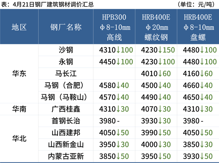 4月21日,9家下调建筑钢材出厂价30-150元/吨。