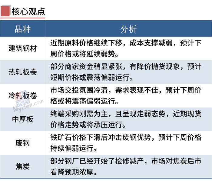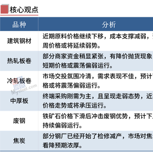 Mysteel调研目前独立电弧炉钢厂平均亏损75元/吨,247家高炉钢厂盈利率降至42.42%。随着亏损面进一步扩大,电炉钢厂加大减产力度,高炉厂产量小幅减少。由于钢厂对原燃料采购积极性减弱,进一步降低库存,原燃料价格趋弱运行。短期来看,钢市供需双弱,钢材成本下移,钢价震荡偏弱运行。