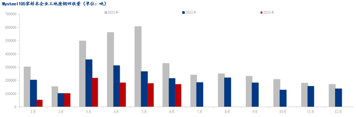 图13:2021-2023年Mysteel105家样本企业工地废钢回收量(单位:吨)