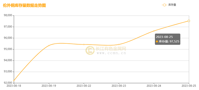 如上图所示,本周伦铜库存继续上涨,累积增加5,325吨至97,525吨,环比上周涨幅5.78%。