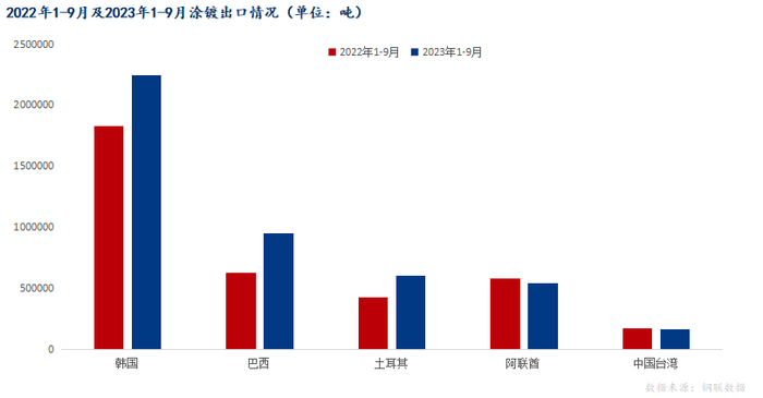从涂镀板(不含冷系)出口情况来看,TOP5国家及地区分别为土耳其、韩国、阿联酋、巴西、中国台湾。TOP5国家2023年总出口涂镀板材450.37万吨,同比增23.95%。从以上五个国家及地区增幅来看,土耳其同比增40.25%;韩国增22.88%;阿联酋减6.14%;巴西增51.16%;中国台湾减3.94%。由此可见,土耳其虽然同比也有不小的增幅,但远不及热卷,相反韩国对涂镀进口量增量较为明显。按照往年情况来看,韩国逐渐从采购基板转至采购成品材,因此预计四季度以及2024年我国基材出口格局或将继续维持现有格局。