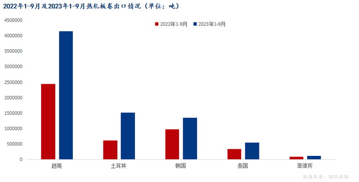 从热卷出口TOP5目的地情况来看,分别为越南、土耳其、韩国、泰国、菲律宾,TOP5国家2023年1-9月份出口770.01万吨,占热卷总出口量52.00%。从以上五国2023年1-9月出口增幅来看,土耳其同比增148.21%;越南增69.66%;韩国增38.94%;泰国增64.46%;菲律宾增24.39%,整体TOP5国家同比增幅达到72.37%。