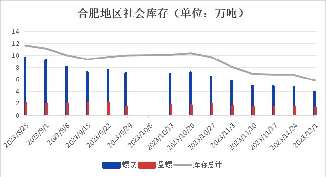 库存方面,本周合肥建材社会库存继续小幅减少,截止12月1日,合肥建材社会库存为5.79万吨,较上周减少0.9万,其中螺纹钢3.91万吨,盘线1.25万吨。钢厂利润尚可,供应持续高位,厂库库存保持低位,盘螺库存增多,螺纹18规格基本断货。有传言称下周会有部分陕西资源流入,但未得到证实,后续持续关注北材南下节奏。市场心态谨慎,商家保持低库存运行。