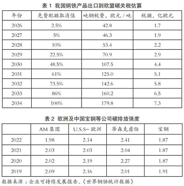 但事实上,到2026年欧盟正式征收碳关税时,我国出口钢铁产品的碳排放强度并不一定高于欧盟同类产品。以宝钢为例,其碳排放强度低于欧洲AM集团、蒂森克虏伯等公司,因此宝钢出口到欧洲的钢铁产品所缴纳的碳关税比AM集团等公司更低,更具竞争力。