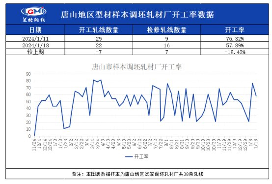 兰格钢铁网统计唐山24家样本轧钢企业共38条轧线,在产22条,停产16条,停产轧线数较上期统计增加7条,开工率为57.89%,当地厂库仍居于高位,部分轧钢企业自主停产,开工率回落。