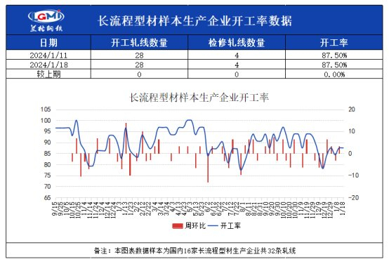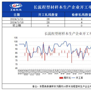 兰格调研:截至1月18日15:30,兰格钢铁网统计国内16家长流程样本生产企业共32条型钢轧线,在产28条,停产4条,停产轧线数与上期统计(1月11日)相比未有变化,开工率为87.5%,目前长流程钢厂大多正常生产,开工总体稳定。