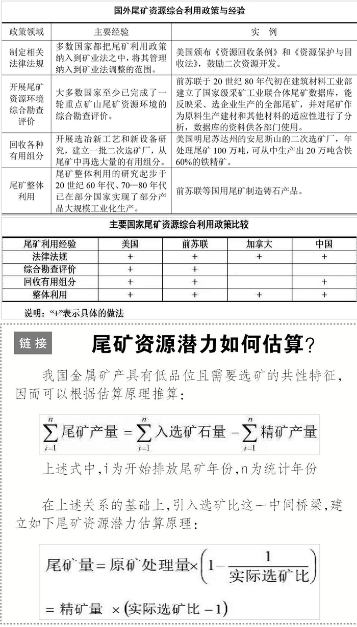 尾矿的诸多问题越来越受到社会各界广泛关注,亟待借鉴国外经验,在开展全国性尾矿资源环境调查评价的基础上,通过政策支持鼓励尾矿资源综合利用,使之“变废为宝、变害为利”。