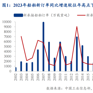 但需注意,船舶新订单增速具有一定周期性。而对比历史新接订单走势,2023年船舶新订单同比增速56.4%,处在周期峰值,但其增速较2021年的同比增速151%明显回落(图1)。