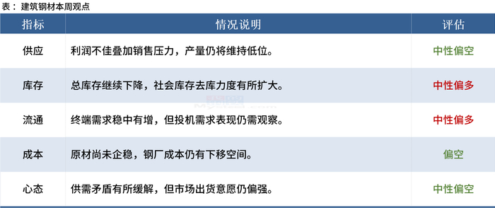 展望本周钢铁市场,或将维持震荡反弹的运行态势,主要理由:一是宏观上看经济平稳向好;二是钢材库存拐点已至,周度降库幅度略超预期,市场信心得到较好的修复;三是期货盘面原燃料价格反弹,或将带动现货价格企稳甚至反弹。