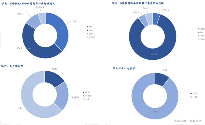 据Mysteel调研从家电行业用钢量来看,截至4月底,调研了解到家电行业样本企业5月份新增订单量增加的企业处于较高水平,较4月预期环比新增订单增长10.53个百分点。目前家电行情生产饱和度尚可,成品资源消耗速度一般。