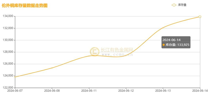 如上图所示,本周伦铜库存继续垒库,累积增加10125吨至133,925吨,环比上周涨幅8.18%.