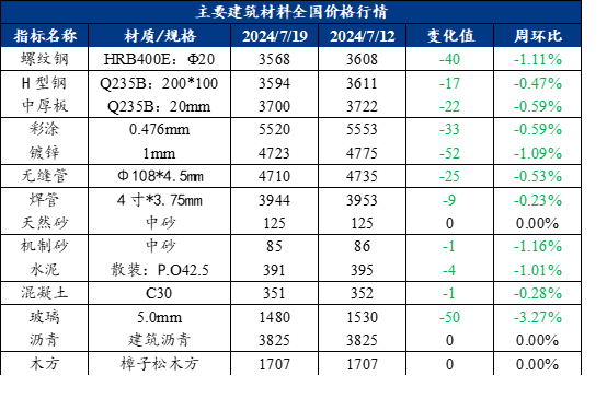 本周建材市场继续下行,全国螺纹钢均价周环比下跌40元/吨。上周钢厂亏损扩大,产量继续下降,需求保持低位,库存继续下降,不过部分区域受新旧国标调整影响,市场抛售旧标资源的操作较多,现货价格跌幅较为明显。