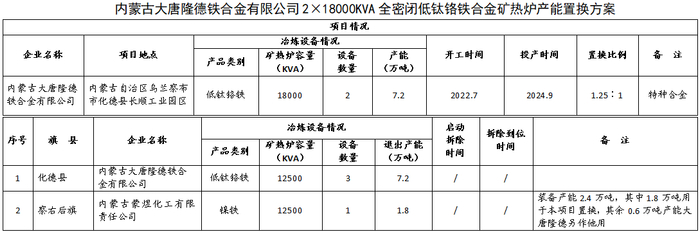 内蒙古大唐隆德铁合金2×18000KVA全密闭低钛铬铁合金矿热炉技改项目产能置换方案公告
