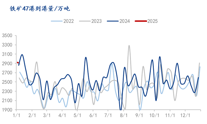 从铁矿供给看,本轮矿山资本开支在2020年前后开始增长,预计铁矿石进入新一轮产能扩张周期,25年到26年将迎来矿山产能集中释放。 从2025年全球铁矿石供应增量来看,上半年增产压力不大,新增产能集中在明年下半年以及2026年之后。四大矿山2025年增量约2500万吨,非主流矿2025预计增加3000万吨。但值得注意的是由于非主流矿成本较高,在矿价低于其成本线的情况下,就可能存在供应减量。从2601合约来看,西芒杜项目开始投产给本就宽松的铁矿石供给“火上浇油”,其年产1.2亿吨65%品位以上高品矿对于整体铁矿石价格来说,远月价格压力大于近月。