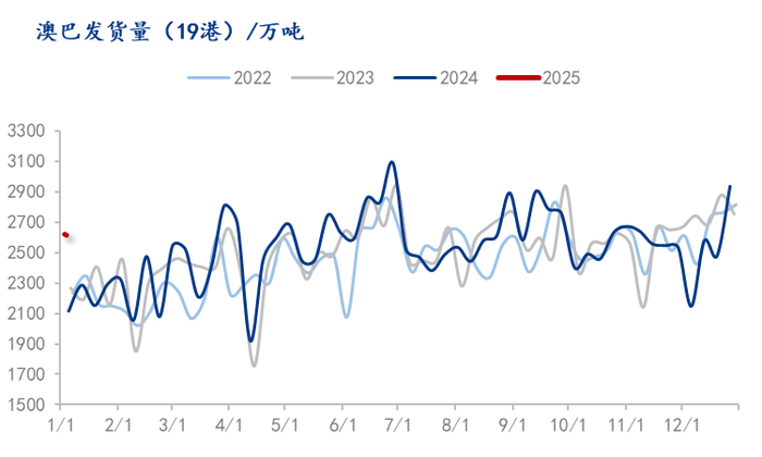 从供给端来看,铁矿石由于澳洲巴西位于南半球,在一季度经常受飓风等天气影响在一季度的发运是最少的。发往中国的铁矿石运输时间在15天到45天不等,一季度的减量发运会在3-5月的到港数据上有所体现。而第三季度在前一财年冲量结束后属于新财年,发运较二季度同样有所减量。