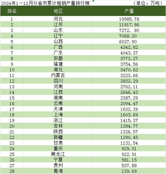 国家统计局:2024年1—12月分省市累计粗钢产量前三名为河北、江苏、山东