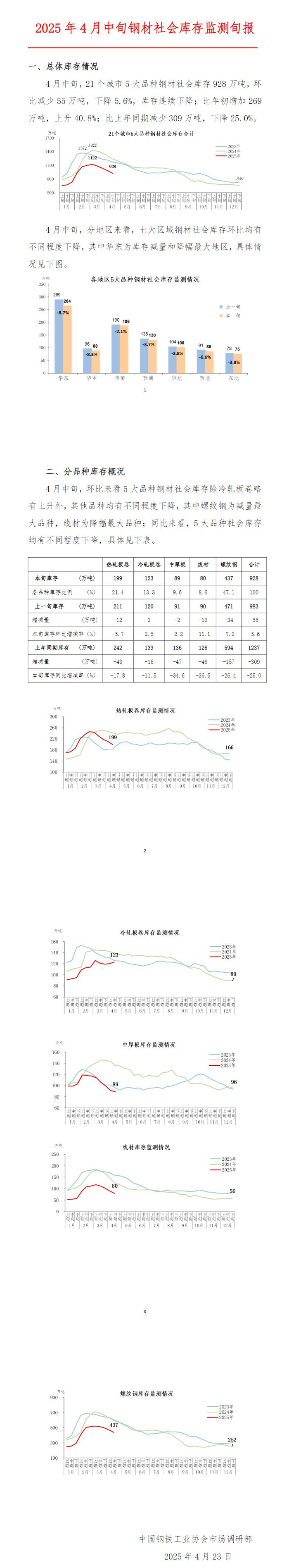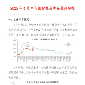 中钢协:4月中旬钢材社会库存928万吨,环比下降5.6%