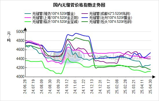 4月30日国内主流无缝管价格持稳,临沂钢投价格下调20元,现20#热轧管坯市场价格报3400元。据兰格钢铁网数据平台监测显示,聊城地区中等热轧管均价4050元,沧州地区报4130元,无锡报4280元,与上个交易日相比持平。