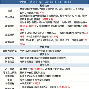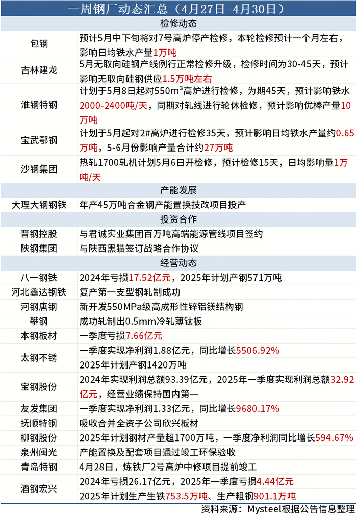 据Mysteel不完全统计,本周(4月27日-4月30日)5家钢厂发布检修信息,具体如下: