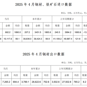 根据海关统计快讯数据,2025年4月,我国进口钢材52.2万吨,环比增加2.1万吨,增长4.2%;均价1690.0美元/吨,环比减少8美元/吨,下降0.5%。1-4月累计进口钢材207.2万吨,同比减少33.3万吨,下降13.8%。