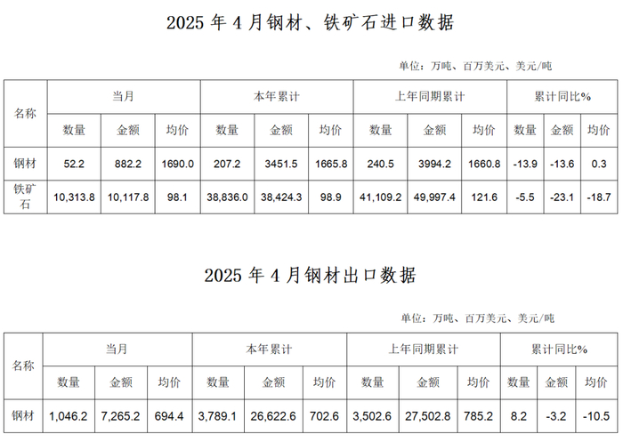 2025年4月,我国出口钢材1046.2万吨,环比增加0.6万吨,增长0.06%;同比增加57.44万吨,增长5.8%;均价694.4美元/吨,环比增加0.9美元/吨,增长0.1%。1-4月累计出口钢材3789.1万吨,同比增加286.5万吨,增长8.2%。