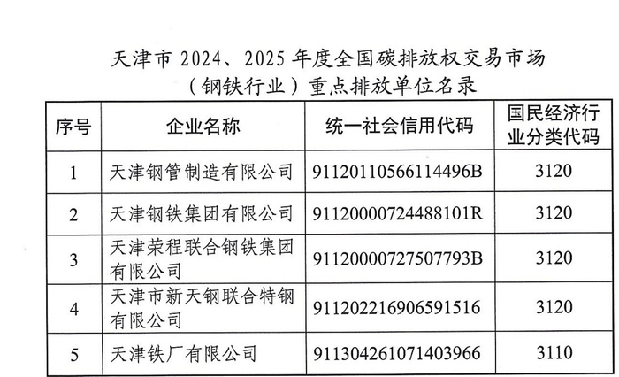 天津市2024、2025年度全国碳排放权交易市场钢铁行业重点排放单位名录公示