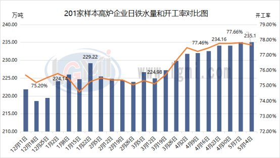 兰格调研:全国201家生产企业日均铁水产量小幅减少(5月14日)
