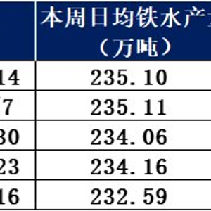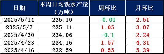 2025年5月14日,据兰格调研,全国201家生产企业铁水日均产量为235.1万吨,周环比减少0.01万吨,总体月环比增加2.51万吨;25年3月日均铁水产量为227.17万吨,25年4月日均铁水产量为232.93万吨,25年5月日均铁水产量为235.11万吨。