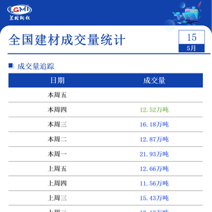 5月15日全国建材成交量大幅减少