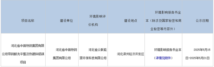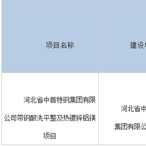 河北省中首特钢集团带钢酸洗平整及热镀锌铝镁项目拟获批