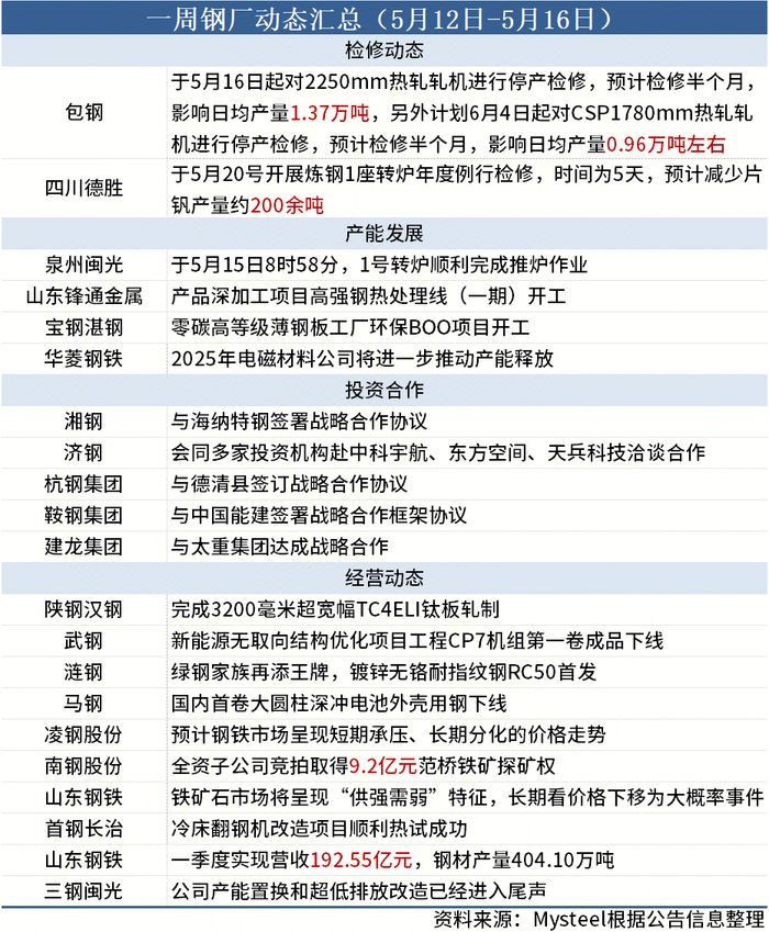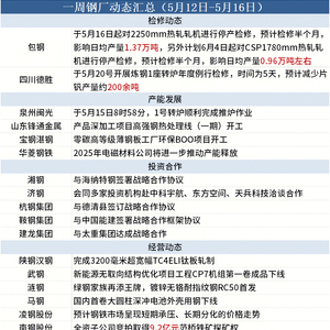 据Mysteel不完全统计,本周(5月12日-5月16日)2家钢厂发布检修信息,具体如下: