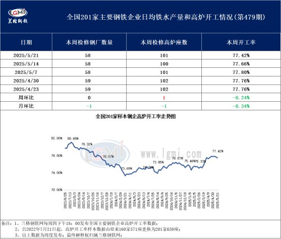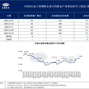 据兰格钢铁网监测数据显示,2025年5月21日全国201家生产企业中有58家钢厂共计101座高炉检修停产,总容积为105190立方米,较上周增加2630立方米,按容积计算主要钢铁企业高炉开工率为77.42%,较上周下降0.24%。