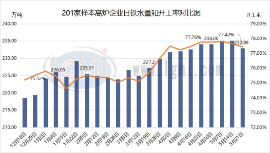 兰格调研:全国201家生产企业日均铁水产量减少(5月21日)