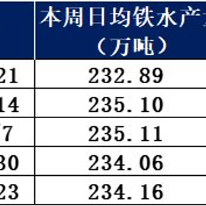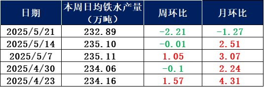 2025年5月21日,据兰格调研,全国201家生产企业铁水日均产量为232.89万吨,周环比减少2.21万吨,总体月环比减少1.27万吨;25年3月日均铁水产量为227.17万吨,25年4月日均铁水产量为232.93万吨,25年5月日均铁水产量为234.37万吨。