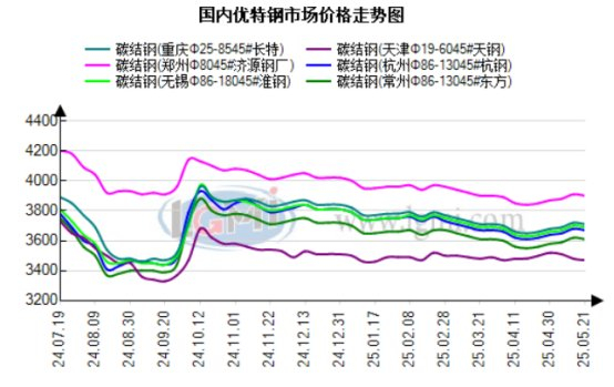 钢厂方面:5月21日,潍坊特钢5月下旬优特钢、热轧管坯维持不变,连铸管坯上调30元:现45#碳结钢出厂3540元,以上为北方价格;5月下旬河南济源钢铁对品种钢产品价格调整如下:-、品种钢棒材产品:各品种规格维持不动。二、品种钢线材、大盘卷产品维持不动,其它系列产品维持不动;淮钢5月下旬出厂:优特钢出厂价格碳合结、管坯维持不变。现29-85mm45#碳结钢出厂3760元,40cr合结钢出厂3990元,20#管坯出厂3760元。以上调价均为含税价格,即5月21日起开始执行;中天钢铁5月下旬优特钢出厂价格碳合结、管坯维持不变。现Φ40-89mm20#管坯出厂3750元,45#碳结钢出厂3780元。以上价格均为含税价格,5月21日起执行。据以上政策可见,本月下旬主流优特钢厂多持稳运行,近日行情波动较小,钢企端也无太大的价格调整动作,心态依旧谨慎为主。
