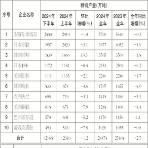 第一,粗钢生产下降。2024年,10家国外企业合计粗钢产量为24478万吨,同比下降2.7%。分企业看,只有巴西盖尔道粗钢产量同比小幅增长,主要原因在于市场需求增长、生产效率提升。下半年,国外企业中只有韩国浦项粗钢产量环比增长,其余企业均环比下降。总体看,国外企业基本呈现出下半年产量环比下降、全年产量同比下降的态势。具体各企业粗钢产量情况见下表:
