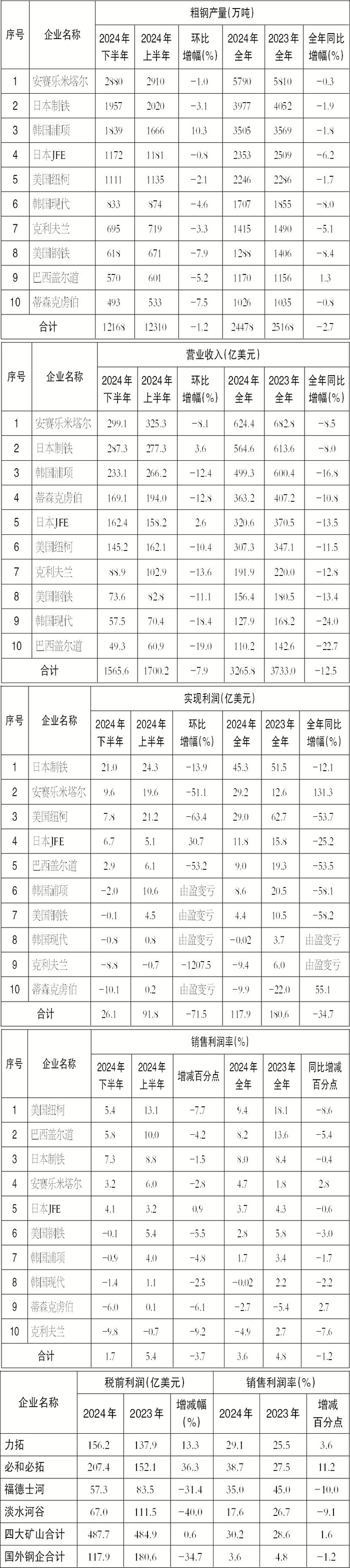 第三,盈利状况下滑,但盈利水平仍相对较高。2024年,10家国外企业合计实现利润117.9亿美元,同比下降34.7%。分企业看,在10家国外企业中,只有安赛乐米塔尔和蒂森克虏伯利润同比增长,其余8家企业同比均大幅下降。日本制铁2024年盈利状况非常突出,通过关闭高炉、减少供给来压缩固定成本,并提高面向车企等大客户的销售价格;主动调整经营结构,大幅度增加电工钢产量;退出与宝钢股份的合资业务,把经营资源集中至美国、印度和东南亚市场;积极拓展海外原料市场,提高原材料自给率。通过这些调整,日本制铁2024年上半年、下半年、全年实现利润均排名第一位,且保持非常大的优势。具体各企业实现利润情况见下表: