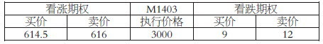 表为某日大连豆粕期权仿真交易价格,标的期货M1403价格为3600元/吨