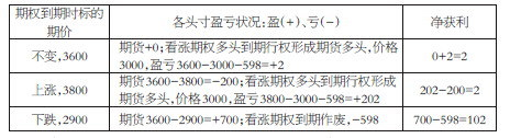 通过买入看跌期权,付出权利金12元/吨,卖出看涨期权,得到权利金614.5元/吨,同时买入一手M1403期货合约,价格为3600元/吨,从而构造转换套利组合。