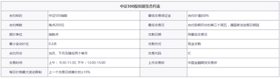 2015年3月16日,中金所发布《中证500股指期货合约》(征求意见稿)和《中国金融期货交易所中证500股指期货合约交易细则》(征求意见稿)。根据最新的征求意见稿,中证500股指期货合约的合约乘数为每点人民币200元。合约价值为股指期货指数点乘以合约乘数。合约以指数点报价,合约的最小变动价位为0.2点指数点,交易报价指数点为0.2点的整数倍。中证500股指合约每日涨跌幅度为上一交易日结算价的±10%。中证500股指期货合约的最低交易保证金为合约价值的8%。合约到期交割方式为现金交割。合约最后交易日为合约到期月份第三个周五,遇法定节假日顺延。合约最后交割日同最后交易日。手续费标准为不高于成交金额的万分之零点五。交割手续费标准为交割金额的万分之一。