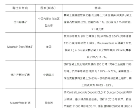 中国稀土矿占全球稀土产量的 84.68%,其中白云鄂博矿区和四川牦牛坪稀土产量分别占全国 83%和 3%;以 Mount Weld 为代表的澳大利亚和以 Mountain Pass 为主要产出地的美国以1 万吨和 4100 吨占全球稀土产量的 8%和 3%。