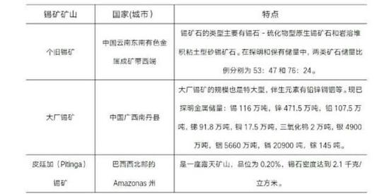 全球锡矿主要集中在中国、印尼、巴西等国,三国合计占比 61%。其中中国的锡储量占比 31%,同时中国也是全球的锡生产国,中国的个旧锡矿和大厂锡矿在 2015 年分别以 247 万吨和 147 万吨的储量,巴西的皮廷加(Pitinga)矿山以 57.5 万吨的储量位居第三。